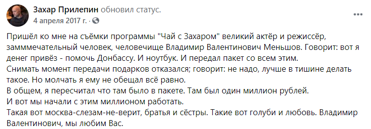 В 2017 году режиссер передал миллион рублей на нужды "ополчения". Об этом рассказывал командир батальона "ДНР" "Призрак", писатель Захар Прилепин.