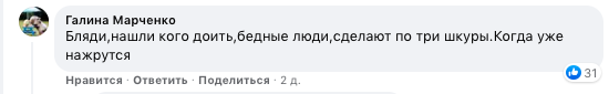 "Бл@ди, нашли кого доить, бедные люди, сдирают по три шкуры. Когда уже нажрутся", - пишет Галина Марченко.