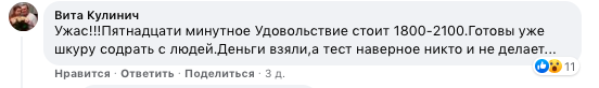 "Ужас!!! Пятнадцатиминутное удовольствие стоит 1800-2100 рублей. Готовы уже шкуру содрать с людей. Деньги взяли, а тест, наверное, никто и не делает", - пишет Вита Кулинич.