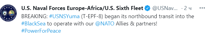 "USNSYuma (T-EPF-8) начал транзит в северном направлении к Черному морю, чтобы работать с нашими союзниками и партнерами по НАТО", - говорится в сообщении.
