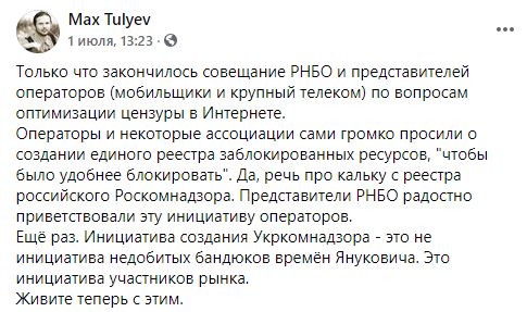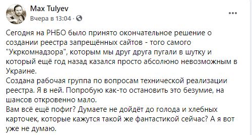 "На СНБО было принято окончательное решение о создании реестра запрещенных сайтов – того самого "Укркомнадзора", которым мы друг друга пугали в шутку и который еще год назад казался просто абсолютно невозможным в Украине. Создана рабочая группа по вопросам технической реализации реестра. Я в ней. Попробую как-то остановить это безумие, на шансов откровенно мало", – написал Тульев.