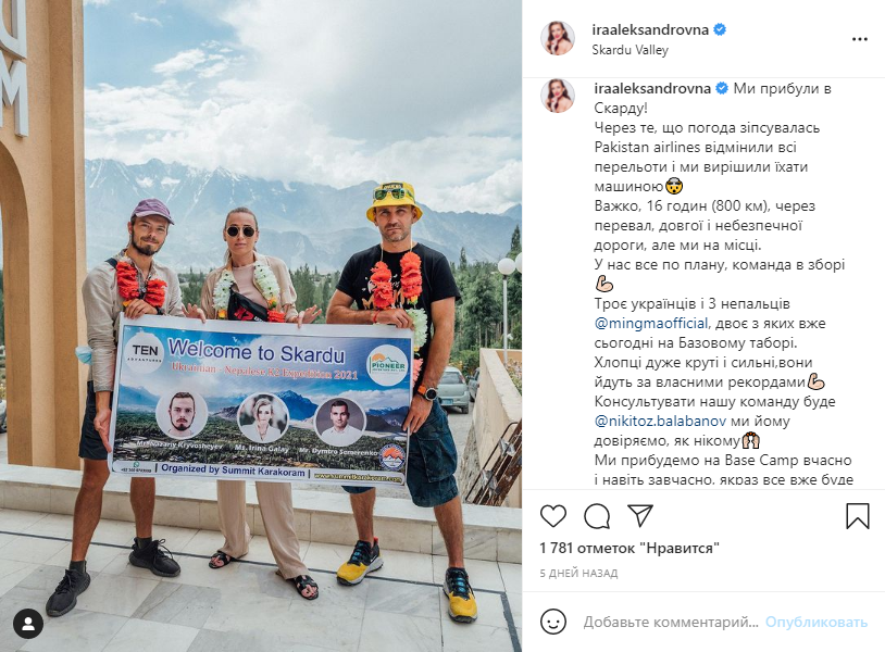 Девушка уже прибыла в Пакистан, где в составе украино-непальской экспедиции попытается подняться на вершину. Видеоматериал с первого дня в Пакистане Галай обнародовала на своей странице в Instagram.