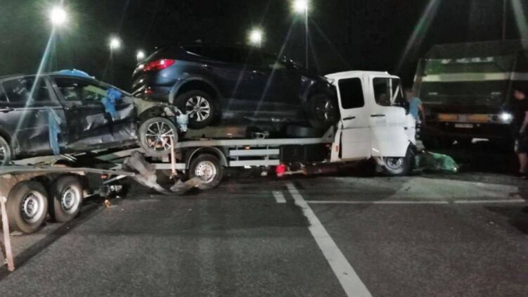 Ночью под Киевом столкнулись два грузовика. На трассе образовалась пробка в пять километров. Один из попавших в аварию грузовиков перевозил дефективные автомобили из США.
