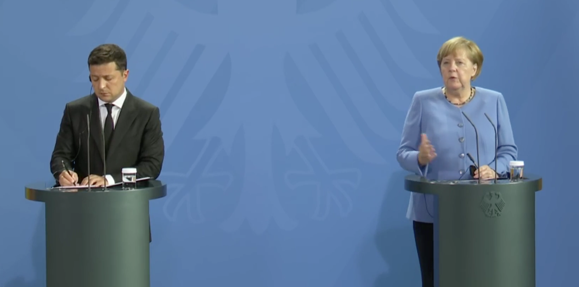 Ангела Меркель приняла Зеленского вечером на ужин. Перед началом их переговоров состоялся брифинг. Меркель заявила о заинтересованности в том, чтобы Украина продолжила быть транзитной страной для российского газа, в том числе после запуска "Северного потока - 2".