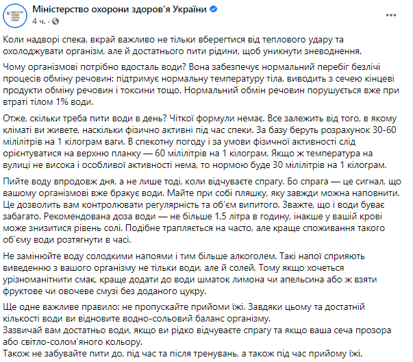 "Почему организму нужно достаточно воды? Она обеспечивает нормальное течение множества процессов обмена веществ: поддерживает нормальную температуру тела, выводит с мочой конечные продукты обмена веществ, токсины и тому подобное. Нормальный обмен веществ нарушается уже при потере телом 1% воды", - рассказали в МОЗ.