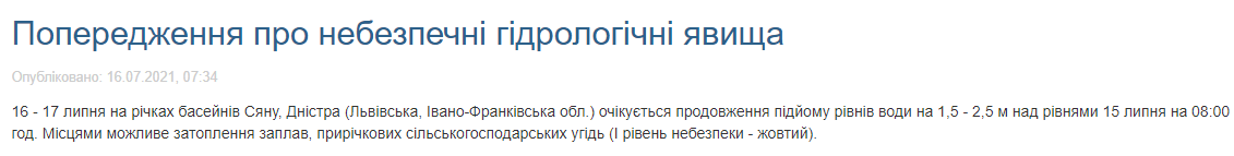 "На реках бассейнов Сяна, Днестра (Львовская, Ивано-Франковская области) ожидается продолжение подъема уровней воды на 1,5 - 2,5 м над уровнями 15 июля. Местами возможно затопление пойм, приречных сельскохозяйственных угодий (I уровень опасности - желтый)", - сообщили в ГСЧС.