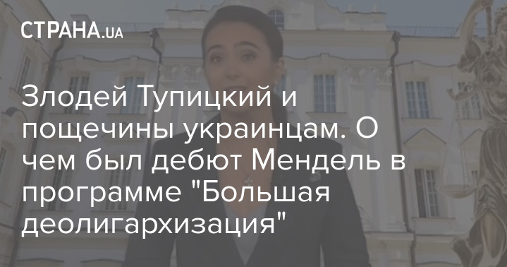 "Итак, у Мендель сегодня дебют в программе "Деолигархизация". Передача под таким названием выходит на канале крупнейшего украинского олигарха Рината Ахметова. Мендель выступила с трехминутным монологом, где в ярких красках и с большим пафосом рассказала какой злодей глава Конституционного суда Тупицкий.