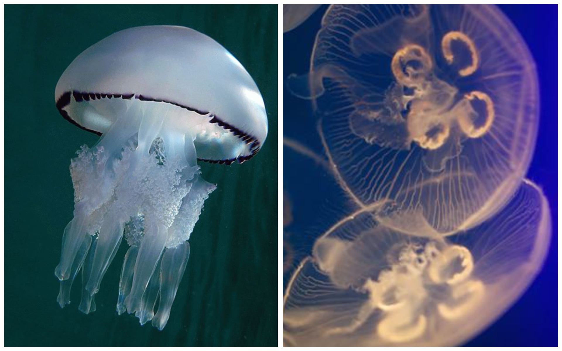 Корнерот (слева) и аурелия или ушастая медуза (справа)