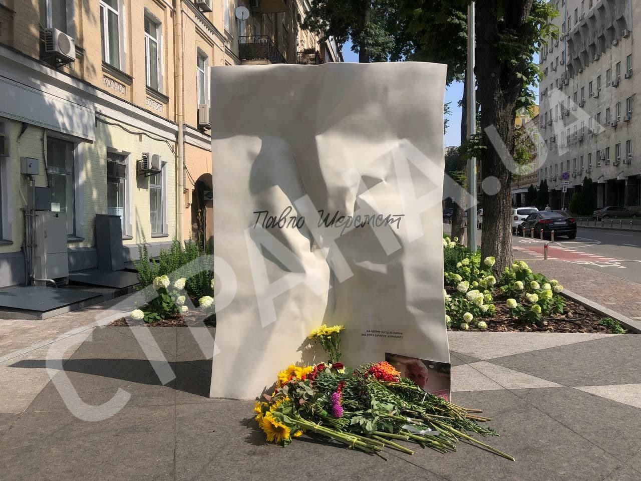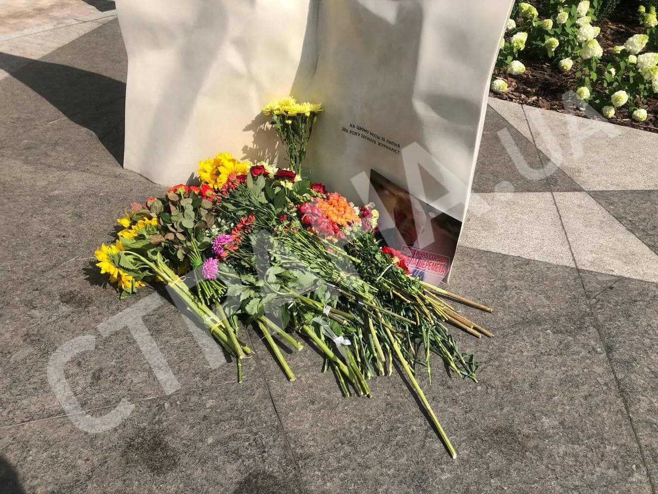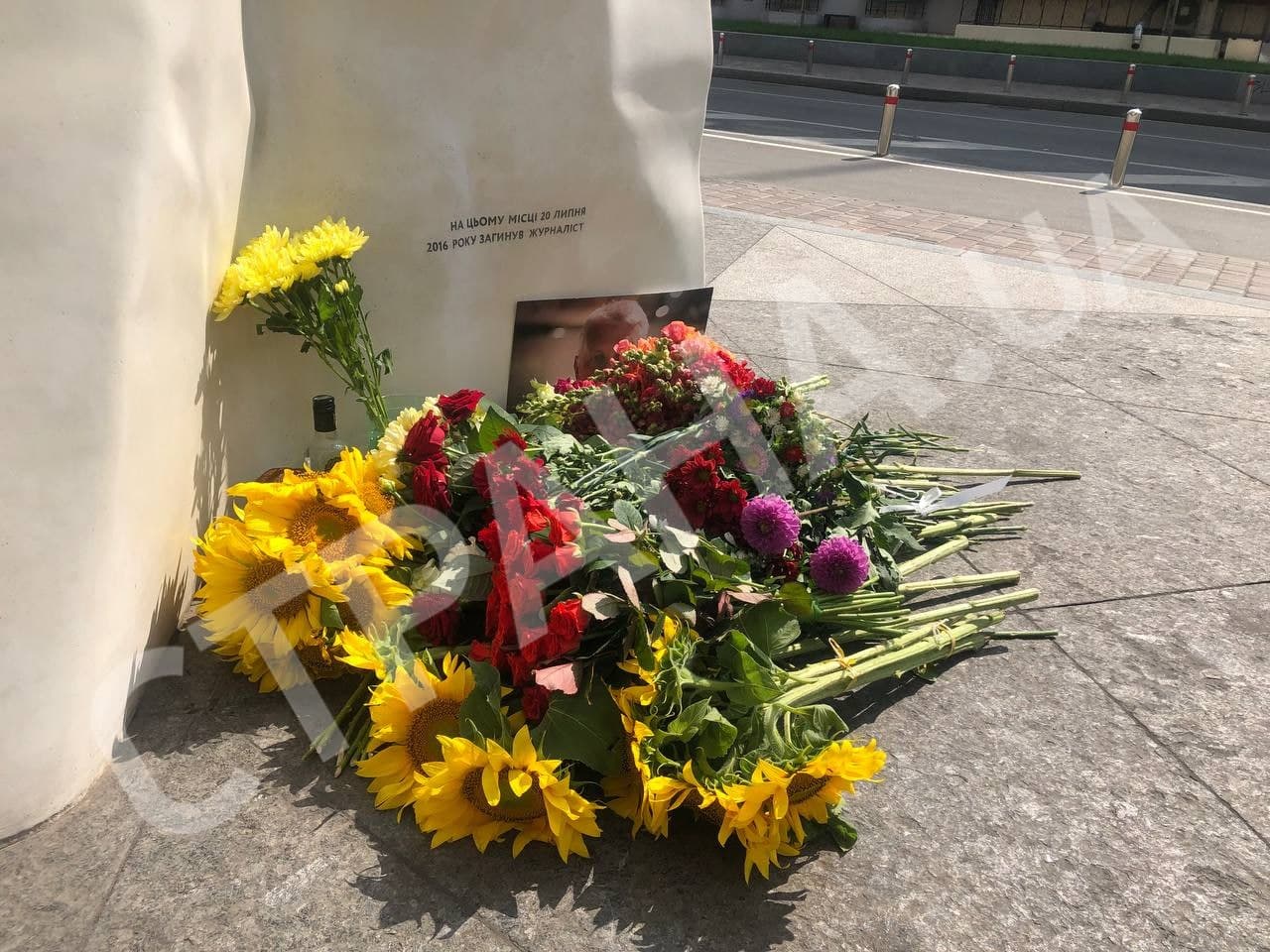 Возле мемориала сегодня возложены цветы - до пятнадцати букетов пышных сезонных цветов. За бутонами расположена фотография Павла Шеремета, подписанная как "Политическое дело". Также кто-то оставил у мемориала маленькую бутылку водки "Козацька рада" и ломоть хлеба.