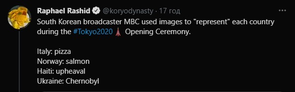 Южнокорейская телекомпания MBC в трансляции официальной церемонии открытия Олимпиады-2020, которая состоялась вчера, 23 июля, использовала не совсем корректные фотоизображения. Так, например, чтобы представить Украину зрителям показали фото Чернобыля.