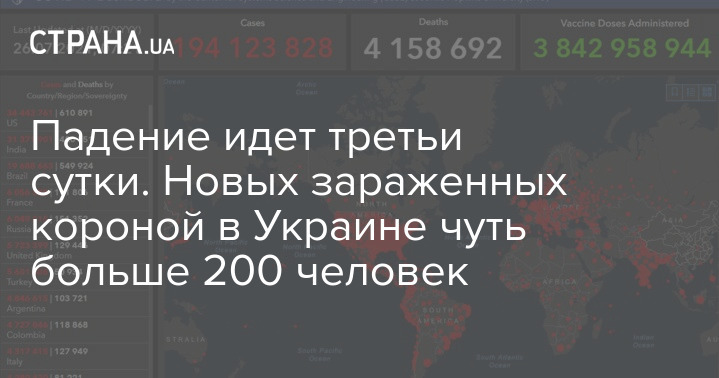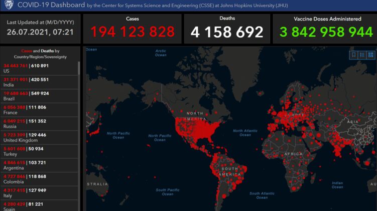 По данным на 26 июля, число зараженных на Земле перевалило за 194 миллиона, фото: университет Дж. Хопкинса