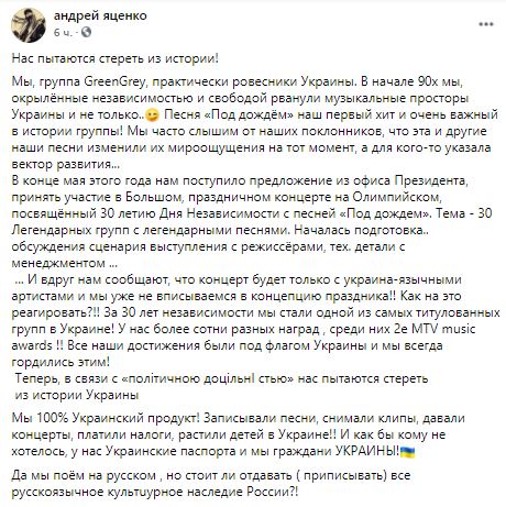 Менее чем за месяц до праздничного концерта ко Дню независимости основатель украинской группы Green Grey Андрей Яценко (Diezel) написал пост, озаглавленный "Нас пытаются стереть из истории Украины".