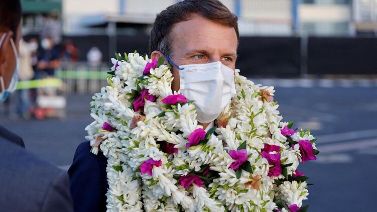 На видео, снятом по прибытии французского лидера в аэропорт, показано, как на его шею по местной традиции вешают один венок за другим. Спустя какое-то время президент Франции появляется в кадре почти полностью облаченный в белые цветы.