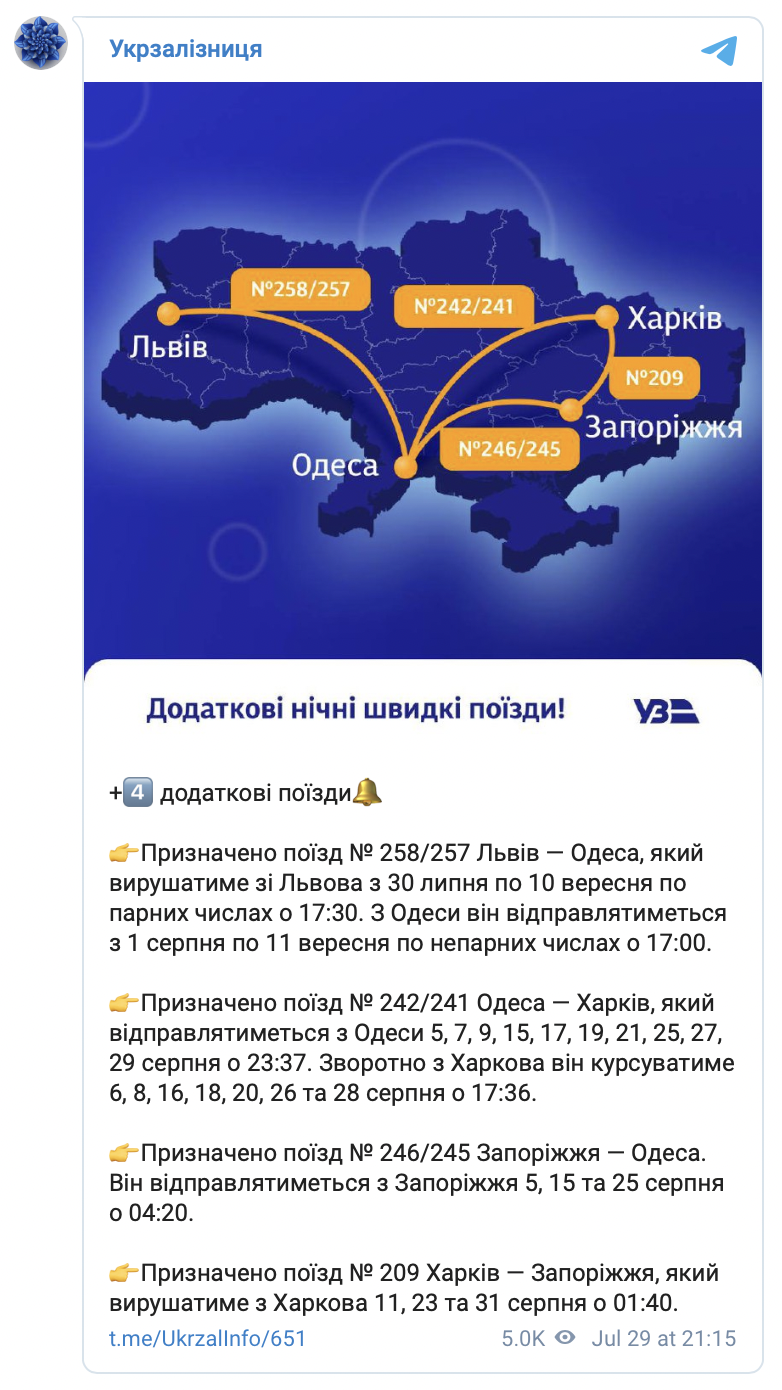 Украинская компания-перевозчик "Укрзализныця" объявила о запуске ночных поездов по четырем направлениям, сообщением с курортными городами - Одессой и Запорожьем.