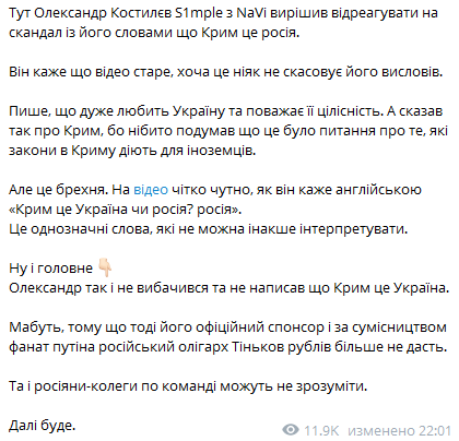 "Я за целостность своей страны. Я люблю Украину. И горжусь тем, что я украинец и представляю страну на мировой сцене, и не один раз выходил с флагом своей страны на самых крупных чемпионатах, потому что для меня это важно. В своё время я ушел из американского клуба Liquid, чтобы вернуться в Украину и продолжить свою карьеру здесь. На видео из трансляции я разминаюсь на тренировке с ботами и просто на автомате отвечал на сообщения в донате. Люди спрашивают, я отвечаю "да/нет" - в таком духе. И на этот вопрос я ответил не особо задумываясь, просто предполагая, что человек, который спрашивает на английском, уточняет о ситуации в Крыму на данный момент: например, какие законы сейчас там по факту действуют для иностранцев, приезда и т.д.".