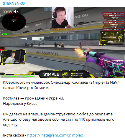 Радикал Сергей Стерненко устроил травлю украинской звезде киберспорта Александру Костылеву (s1mple) за его видео двухлетней давности. На нем Костылев говорит, что Крым - это Россия.