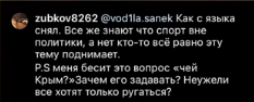 "Как с языка снял. Все же знают, что спорт вне политики, а нет кто-то всё равно эту тему поднимает. Меня бесит этот вопрос "чей Крым?" Зачем его задавать? Неужели все хотят только ругаться?", - спрашивали у Стерненко его же подписчики.