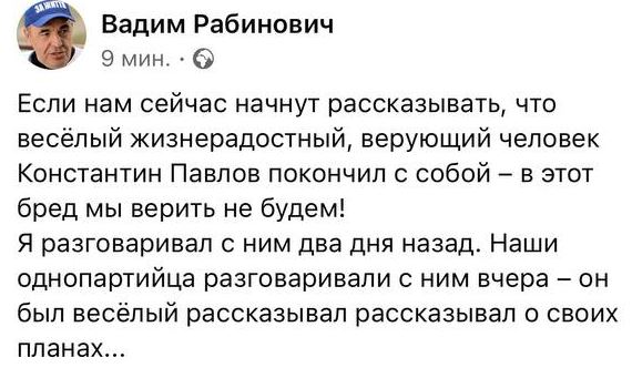 "Я требую от правоохранительных органов создание группы, которая в ближайшие дни ответит нам, кто убил Константина Павлова! Рассказы о самоубийстве – заведомая ложь!" – написал политик у себя на странице в Facebook.