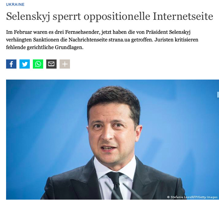 "В феврале закрыли три телеканала, а теперь президент Зеленский ввел санкции против новостного сайта strana.ua. Юристы критикуют это решение за отсутствие правовой основы", - пишет немецкий сайт.
