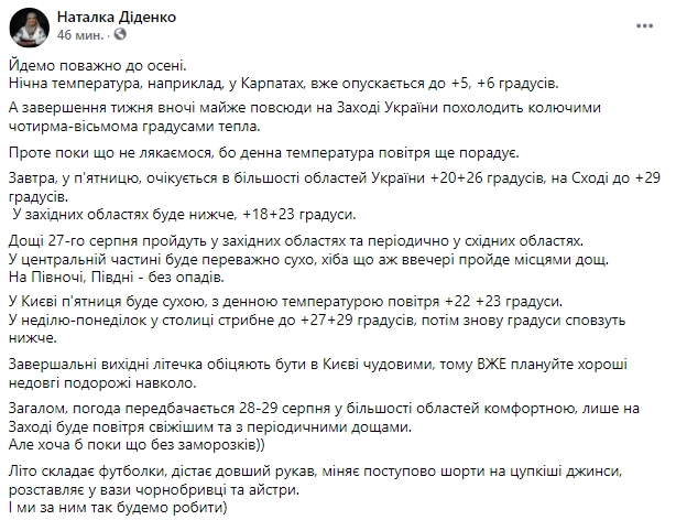 О погоде на завтра рассказала синоптик Наталья Диденко на своей странице в Facebook.