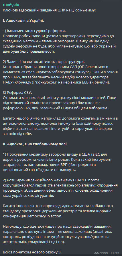 Свой пост, озаглавленный "Ключевые адвокационные задачи ЦПК на эти осень-зиму" Шабунин разделил на 2 блока - "Адвокация в Украине" и "Адвокация в глобальном поле".