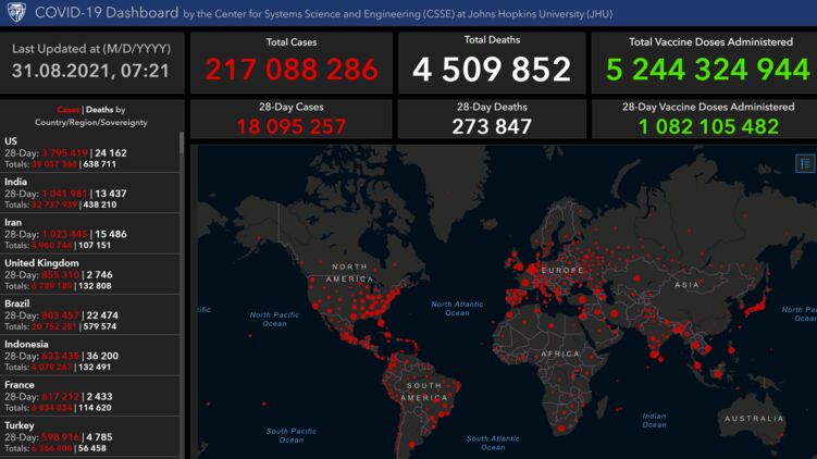 По данным на 31 августа, число зараженных на Земле перевалило за 217 миллионов человек, фото: arcgis.com