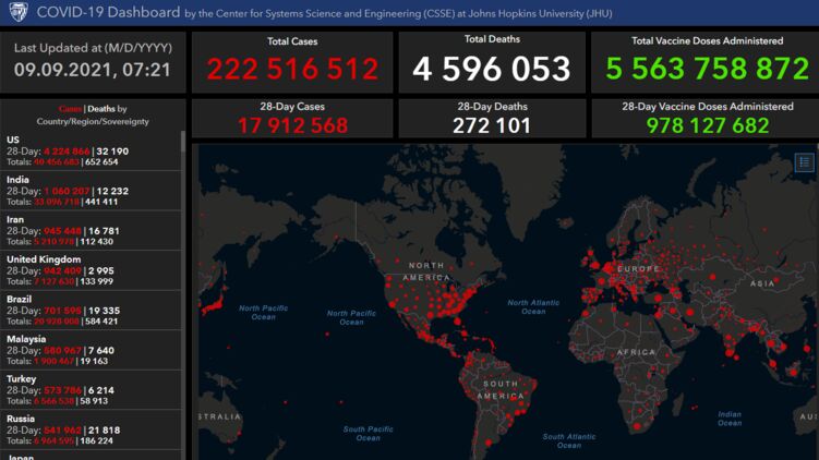 По данным на утро 9 сентября число зараженных в мире значительно превышает отметку в 222 миллиона, фото arcgis.com