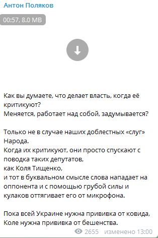 Пока всей Украине нужна прививка от ковида, Коле нужна прививка от бешенства", - написал нардеп Антон Поляков.
