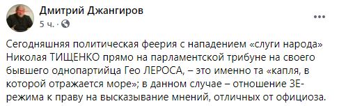 "Сегодняшняя политическая феерия с нападением "слуги народа" Николая Тищенко прямо на парламентской трибуне на своего бывшего однопартийца Гео Лероса – это именно та "капля, в которой отражается море"; в данном случае – отношение Зе-режима к праву на высказывание мнений, отличных от официоза", - написал публицист Дмитрий Джангиров.