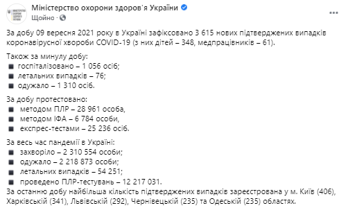 Перед выходными, в пятницу 10 сентября, появились новые статистические данные по эпидситуации в Украине, связанной с перманентной эпидемией коронавируса. Итак, за истекшие сутки общее число зараженных коронавирусом с начала эпидемии в стране выросло еще на 3 615 человека.