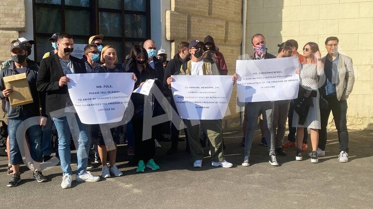 "Мы пришли сегодня к Художественному арсеналу, чтобы обратить внимание европейских партнеров Украины, которые сегодня посещают данный форум, что президент Украины Владимир Зеленский пошёл не по тому пути. В Украине закрывают телеканалы, СМИ, и это будет продолжаться, Зеленский хочет зачистить информационные поле, а для этого ему нужно закрыть все СМИ, которые говорят правду. Зеленский превращаться в диктатора", - заявляют участники акции.