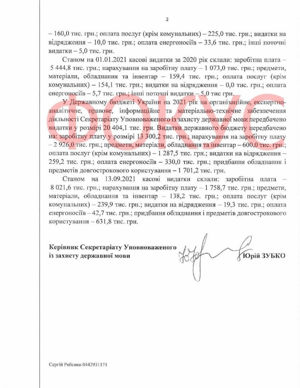 В течение 2020 года со дня создания ведомства 3 августа на секретариат мовного омбудсмена потратили более 6,84 миллионов гривен. Из этой суммы 5,44 миллионов составили зарплаты сотрудников ведомства. А 1,07 миллиона гривен - "начисления на заработную плату".