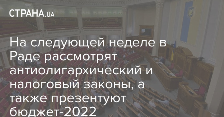 На следующей неделе текущего месяца Верховная Рада займется вопросами антиолигархического и налогового закона, а также презентуют проект государственного бюджета на 2022 год.