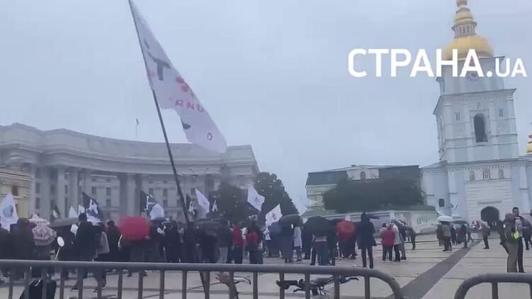 Сегодня, 18 сентября, в Киеве в центре столицы на Софиевской площади у Михайловского собора проходит протест против коронавирусных мер. Люди собрались  с лозунгами "стоп фейк пандемия" и "против обязательной вакцинации".