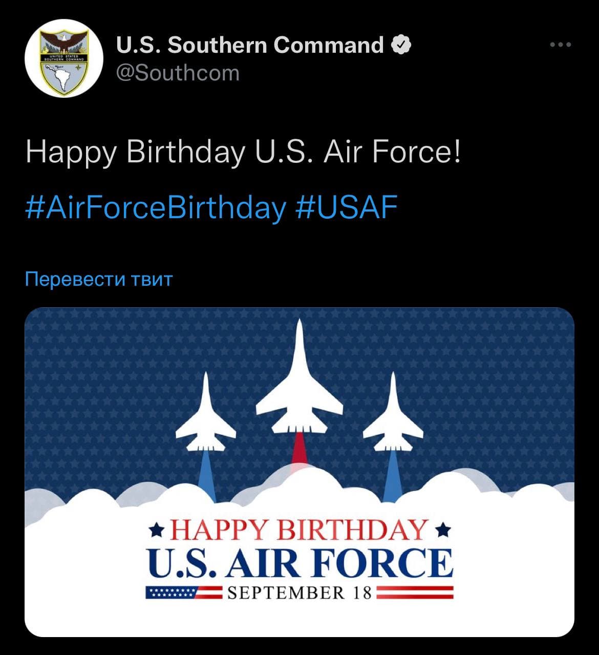 "С днем рождения, американские воздушные силы", - говорится в сообщении Южного командования Минобороны США.