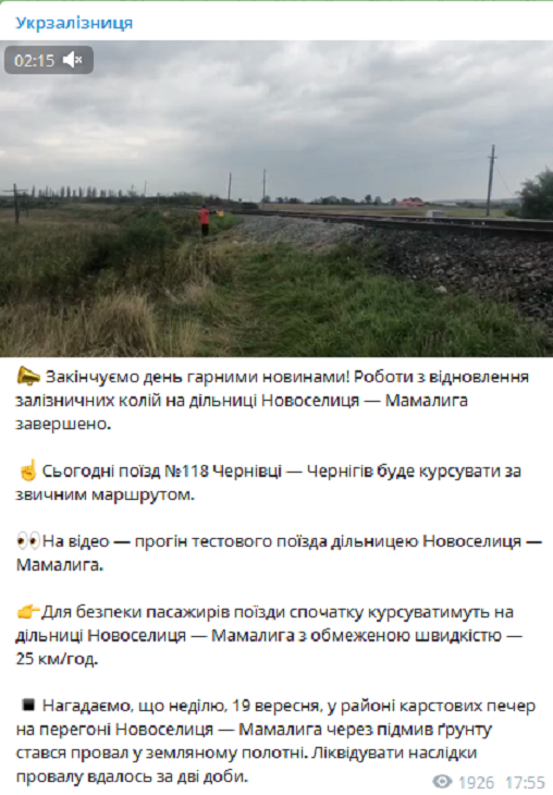 "Укрзализныця" сообщила о завершении работ по восстановлению обвала земли, который произошел под железнодорожными путями на участке Новоселица - Мамалыга. Из-за сложившейся сложившейся ситуации пришлось изменить маршрут поезда.