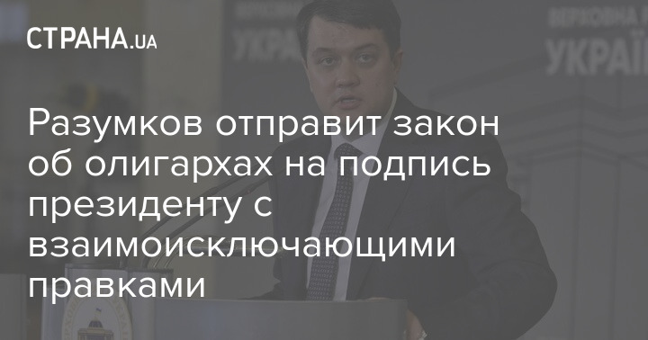 По информации источника "Страны" в Раде, спикер Дмитрий Разумков намерен отправить закон про олигархов на подпись президенту Зеленскому с двумя взаимоисключающим правками, за которые проголосовал в четверг парламент.