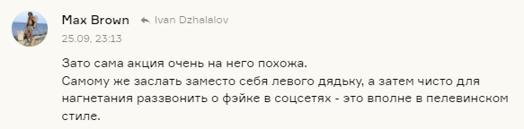 "Зато сама акция очень на него похожа. Самому же заслать заместо себя левого дядьку, а затем чисто для нагнетания раззвонить о фэйке в соцсетях - это вполне в пелевинском стиле", - написал Max Brown.