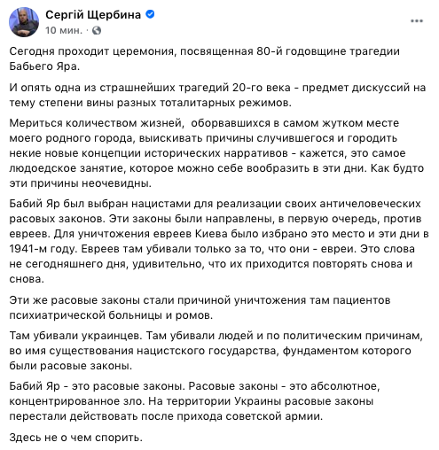 Журналист Сергей Щербина, пишет, что говорить о "вине" СССР в трагедии Бабьего Яра неуместно.