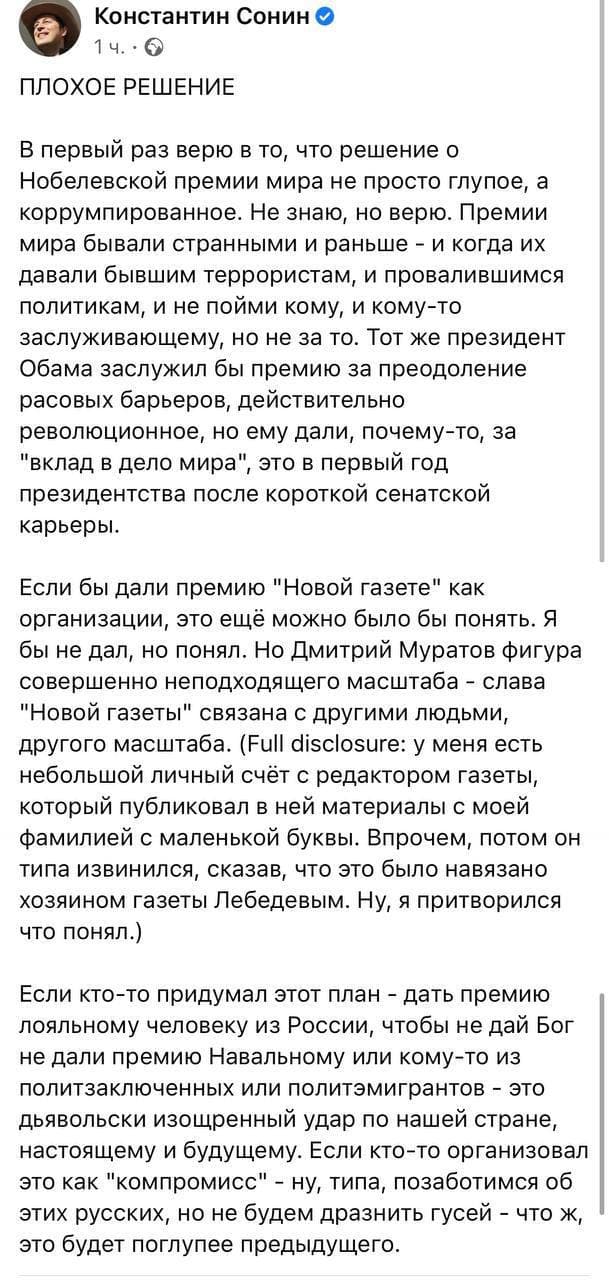 Если кто-то придумал этот план - дать премию лояльному человеку из России, чтобы, не дай Бог, не дали премию Навальному или кому-то из политзаключенных или политэмигрантов - это дьявольски изощренный удар по нашей стране, настоящему и будущему. Если кто-то организовал это как "компромисс" - ну, типа, позаботимся об этих русских, но не будем дразнить гусей - что ж, это будет поглупее предыдущего", - написал в Фейсбуке российский оппозиционер Константин Сонин.