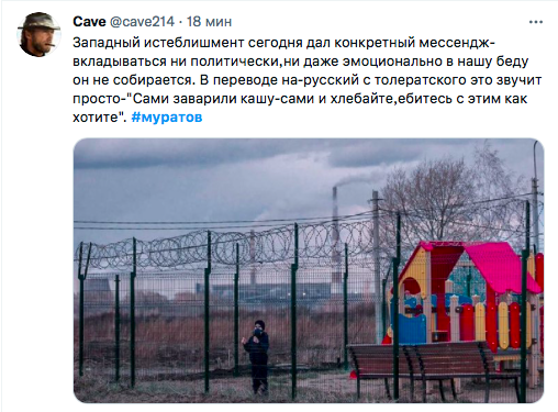 "Западный истеблишмент сегодня дал конкретный мессендж - вкладываться ни политически, ни даже эмоционально в нашу беду он не собирается. В переводе на русский с толерантского это звучит просто - "Сами заварили кашу - сами и хлебайте, е@сь с этим как хотите", - пишет пользователь Cave.