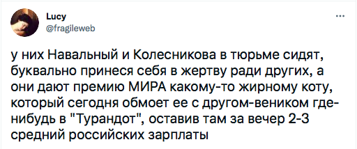 "У них Навальный и Колесникова в тюрьме сидят, буквально принеся себя в жертву ради других, а они дают премию МИРА какому-то жирному коту, который сегодня обмоет ее с другом-веником где-нибудь в "Турандот", оставив там за вечер 2-3 средний российских зарплаты", - пишет пользователь Lucy.