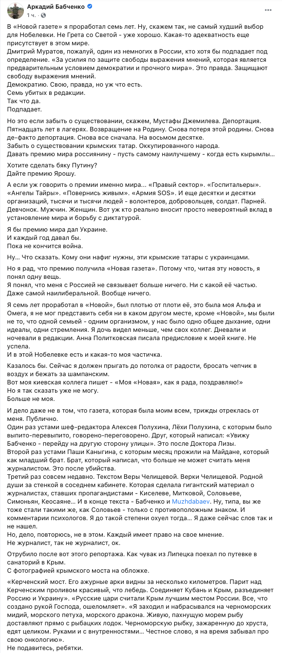 Аркадий Бабченко, который ранее работал в "Новой газете", до сих пор оскорблен, что Дмитрий Муратов от него "отрекся". Так же как и другие корреспонденты издания перестали считать его журналистом после спецоперации СБУ.