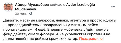 "Давайте, местные малоросы, леваки, агентура и просто идиоты — присоединяйтесь к поздравлениям элитным рейхс-пропагандистам! И ещё. Впервые Нобелевка уйдёт прямо в фонд действующего фюрера. А не украинским сиротам и не детям пленённых рейхом крымских татар. Поздравляю!" - написал Муждабаев.