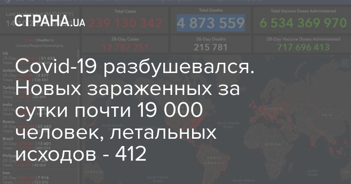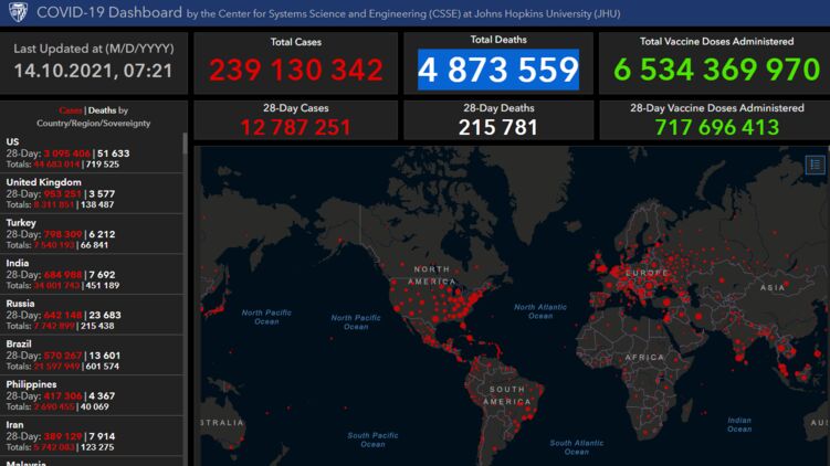 Университет Джона Хопкинса также привел новые данные на утро 14 октября. С начала пандемии на планете уже 239 130 342 человека заразились СOVID-19. Умерли за этот же срок - 4 873 559 человек.