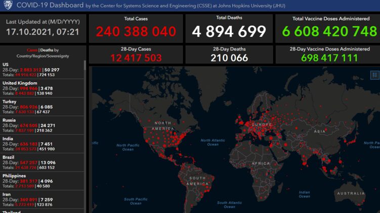 Университет Джона Хопкинса также привел новые данные на утро 17 октября. С начала пандемии на планете уже 240 388 040 человек заразились СOVID-19. Умерли за этот же срок - 4 894 699 человек.