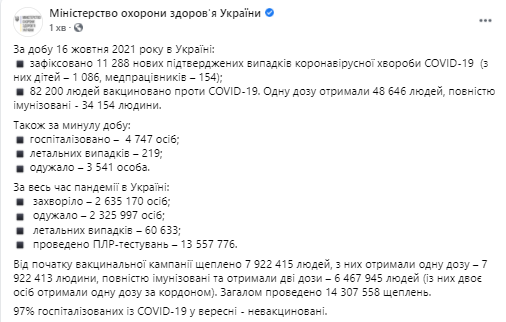 Напомним, что вчера, 15 октября в стране официально было выявлено 12 983 новых случаев заражения. Умерли за минувшие сутки 219 человек (с начала эпидемии в стране число жертв болезни достигло планки в 60 633). Некоторое снижение выявленных суточных заражений объясняется выходными днями в Украине.