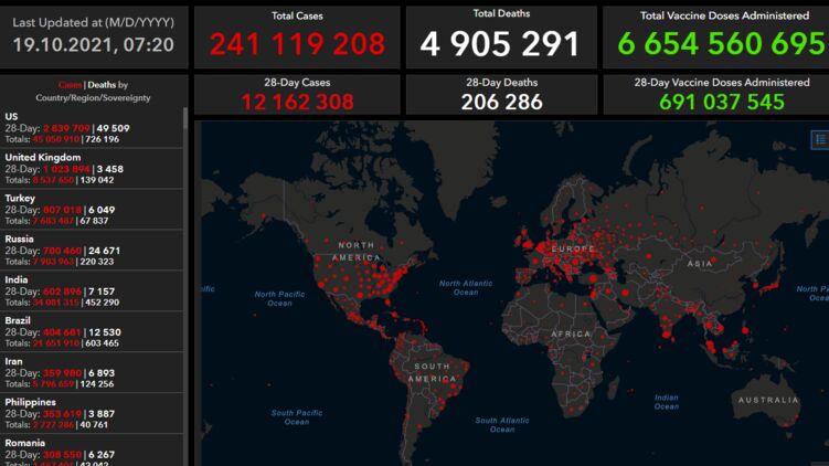 Университет Джона Хопкинса также привел новые данные на утро 19 октября. С начала пандемии на планете уже 241 119 208 человек заразились СOVID-19. Умерли за этот же срок - 4 905 291 человек.
