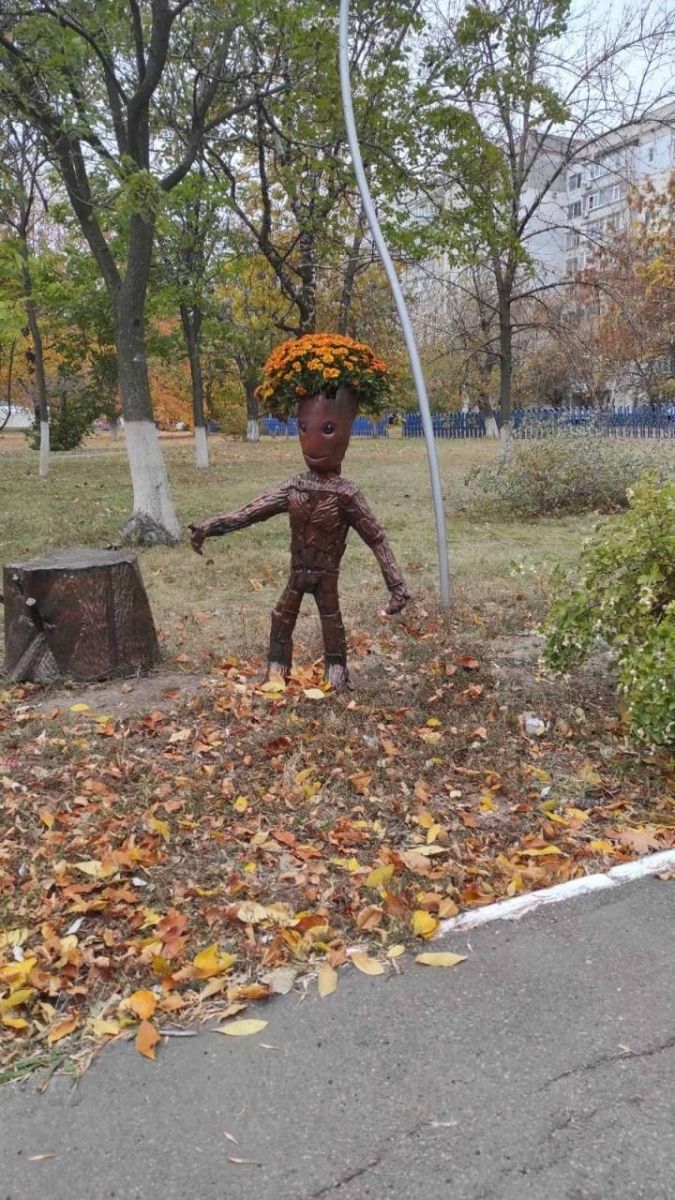 Что касается марвеловского персонажа, то если у оригинала голова напоминает выгнивший изнутри пень, то у Шапошника ее венчает букет цветов.