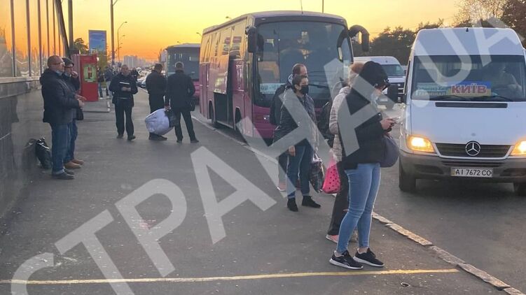 В Киеве возле станции метро "Лесная" в пятницу вечером ажиотаж: из столицы люди, как обычно накануне выходных, уезжают в Бровары и соседнюю Черниговскую область. 22 октября - второй день, когда в Украине действуют ограничения на междугородние и межобластные перевозки. Пассажиры обязаны иметь при себе сертификат о вакцинации или негативный тест на коронавирус.